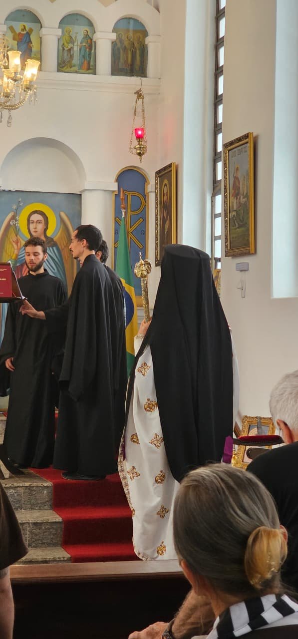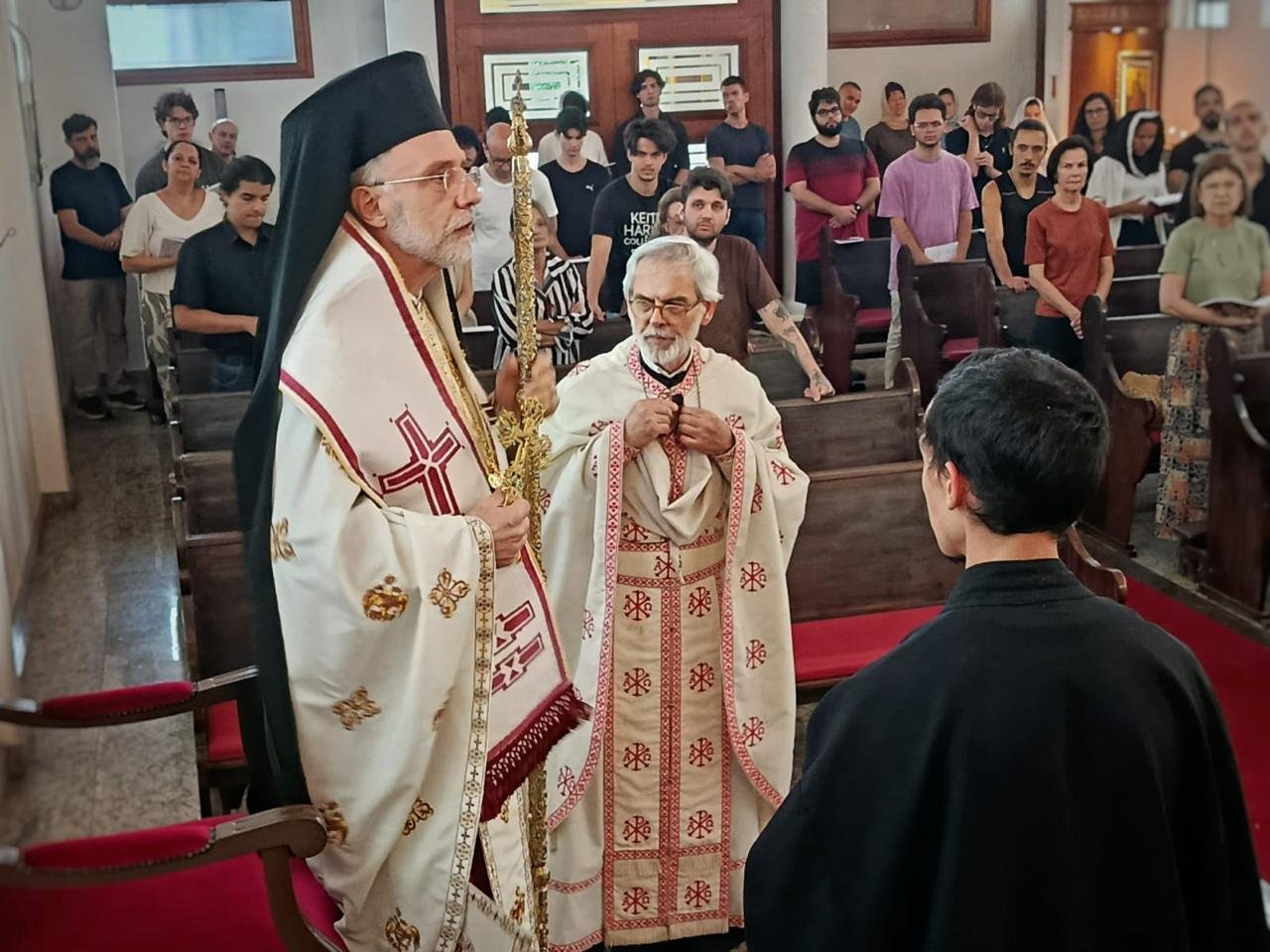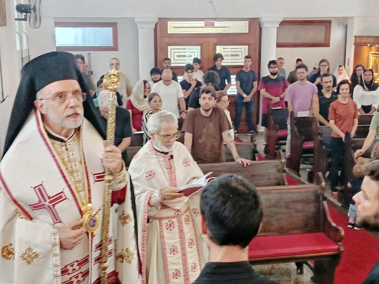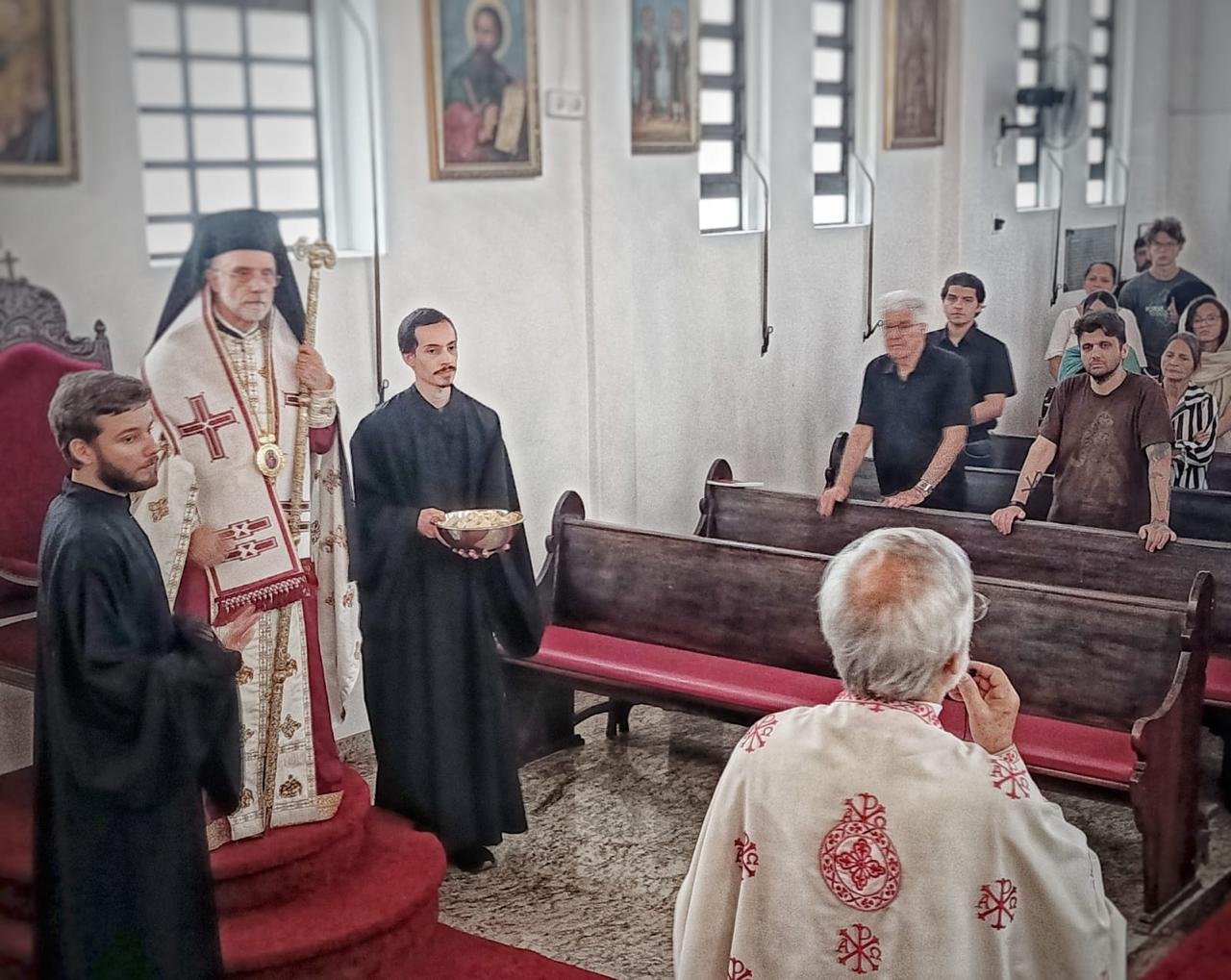 Neste domingo, nossa comunidade reuniu-se para a celebração do III Domingo do Triódion, também conhecido como Domingo do Juízo Final (ou Domingo da Carne). A partir de 8h30, o Pe. André conduziu os ofícios de preparação, seguindo-se o Orthros dominical. Às 10h, teve início a Divina Liturgia, presidida por Dom Irineo, Bispo de Tropaion, e assistida pelo Pe. André.